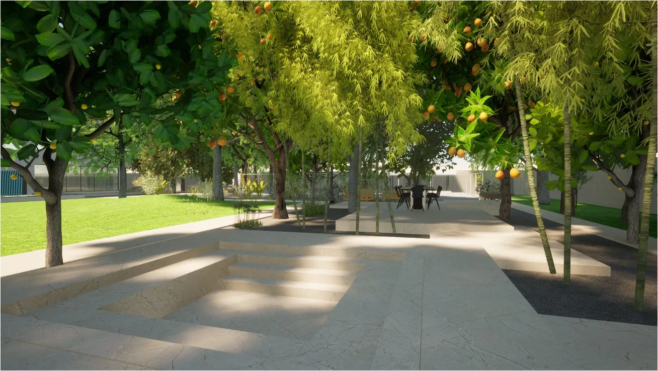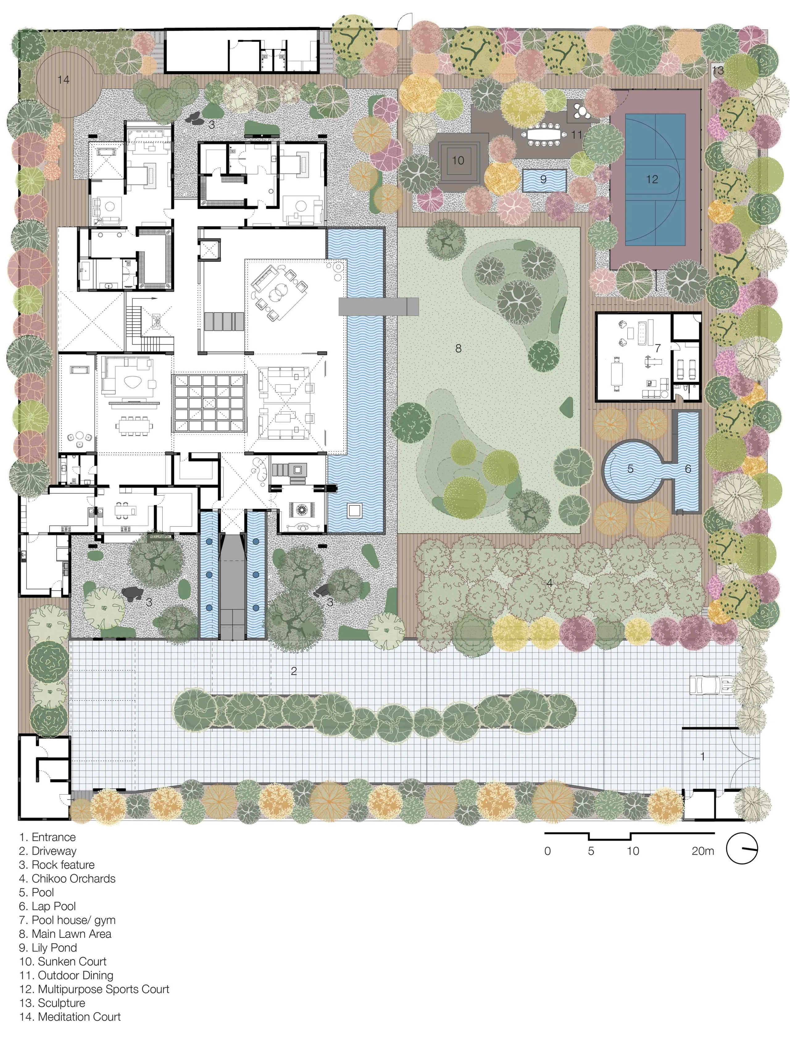 At the entrance, two boulder features frame the entryway, while an orchard along the right side screens the garden from direct visibility, establishing a gradual transition from the driveway. A peripheral pathway runs along the residence, providing structured circulation while connecting to the various courts. The combination of structured courts, diverse planting, and carefully planned transitions ensure a well-balanced landscape that is both practical and visually integrated with the residence.