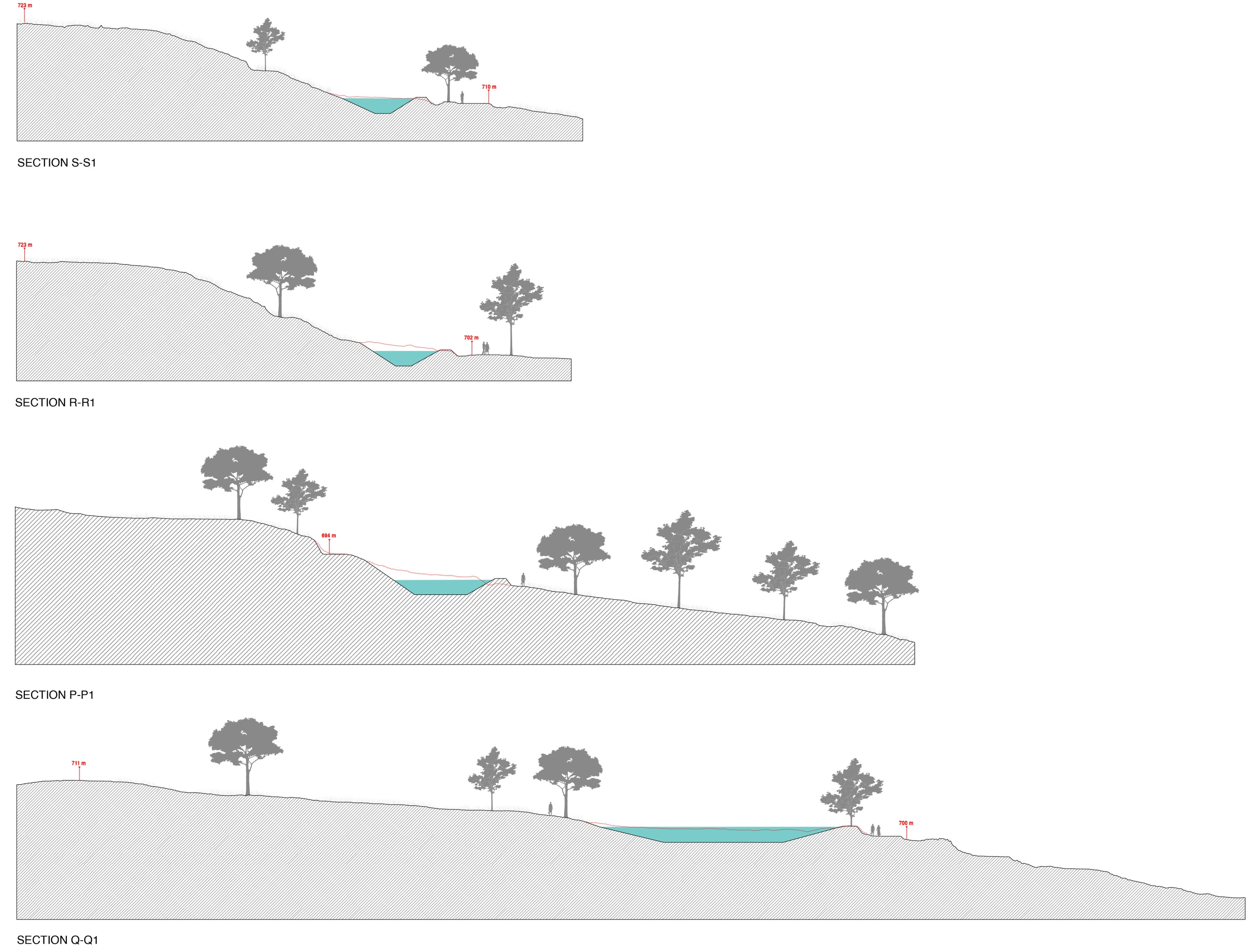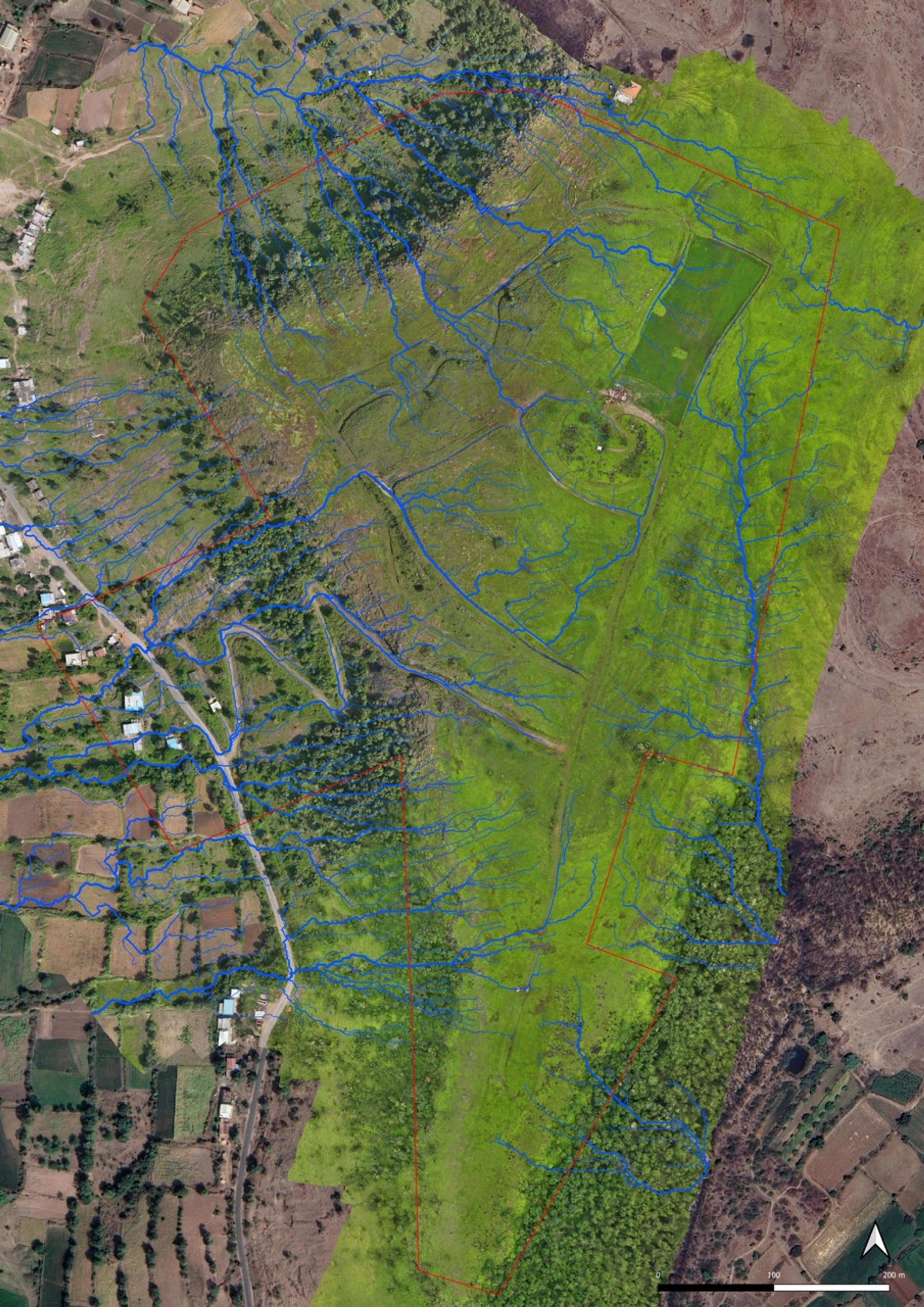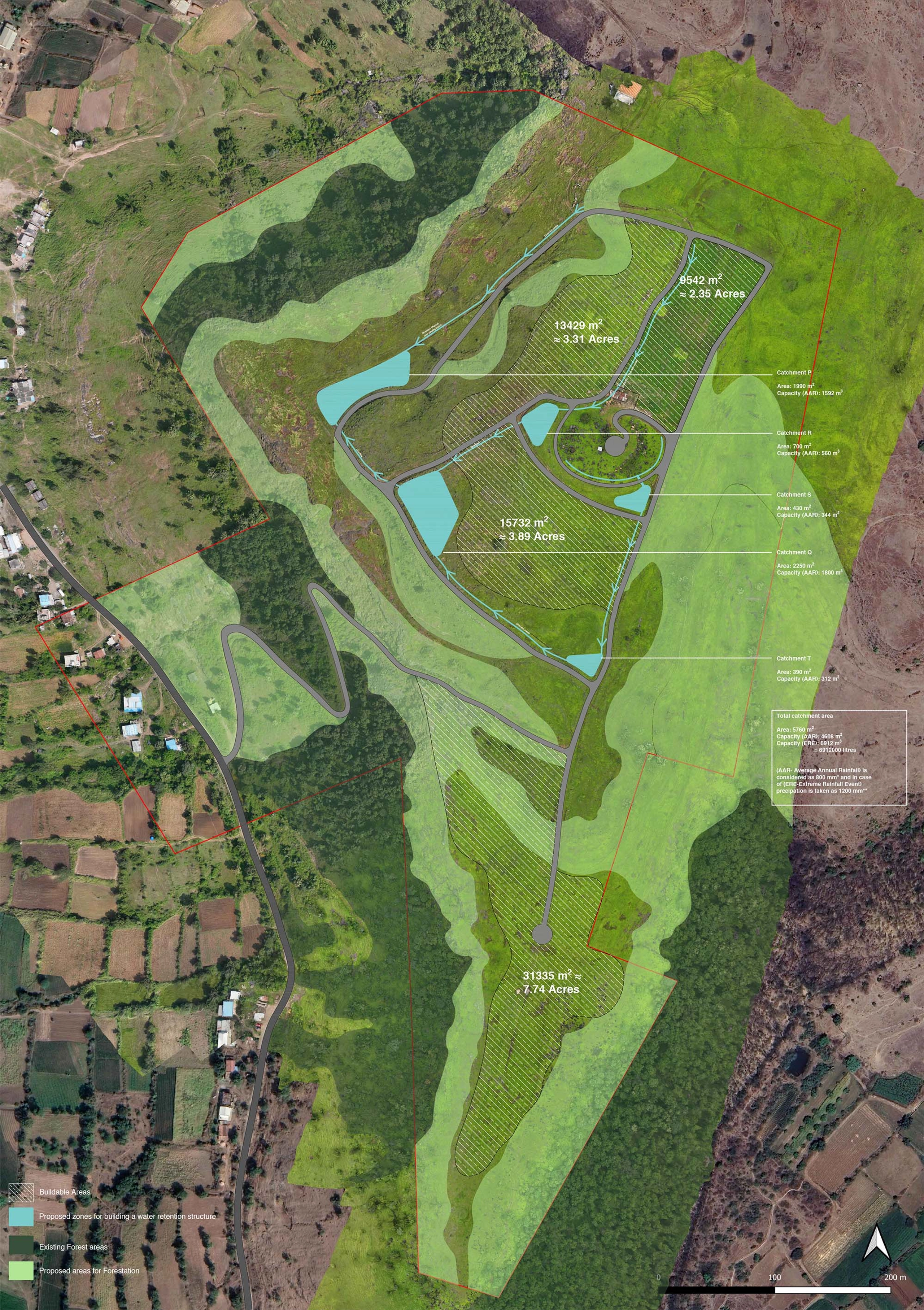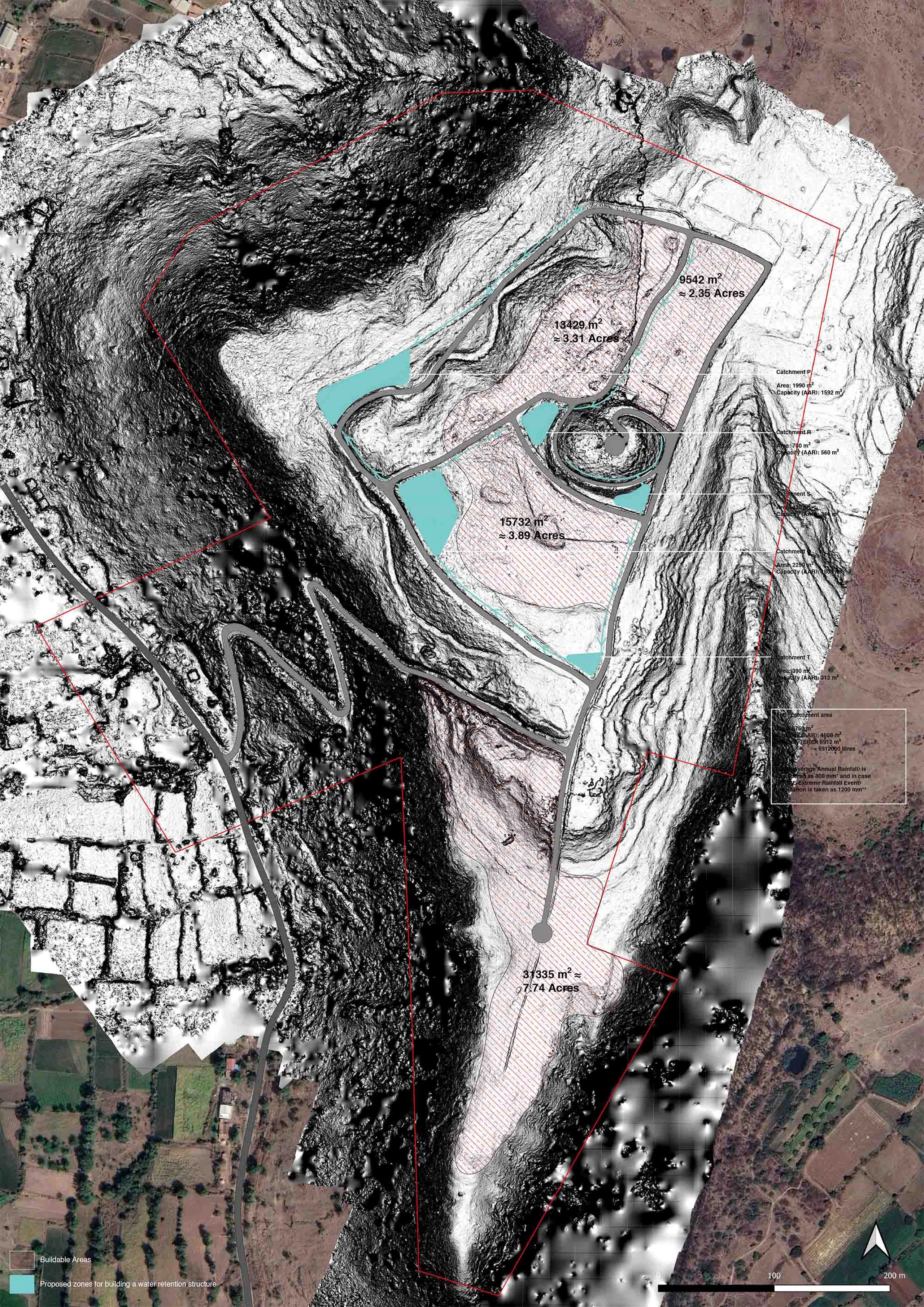 In response to this, the proposed strategy seeks to slow down the water flow across the land while promoting efficient infiltration and hydration. By implementing targeted erosion control measures, such as ponds, hydration swales, and silt traps, the landscape will be sculpted to capture and retain water at different elevations. These interventions not only support the area's natural water retention but also promote a balance between agricultural productivity, ecological regeneration, and the water requirements of the future village.