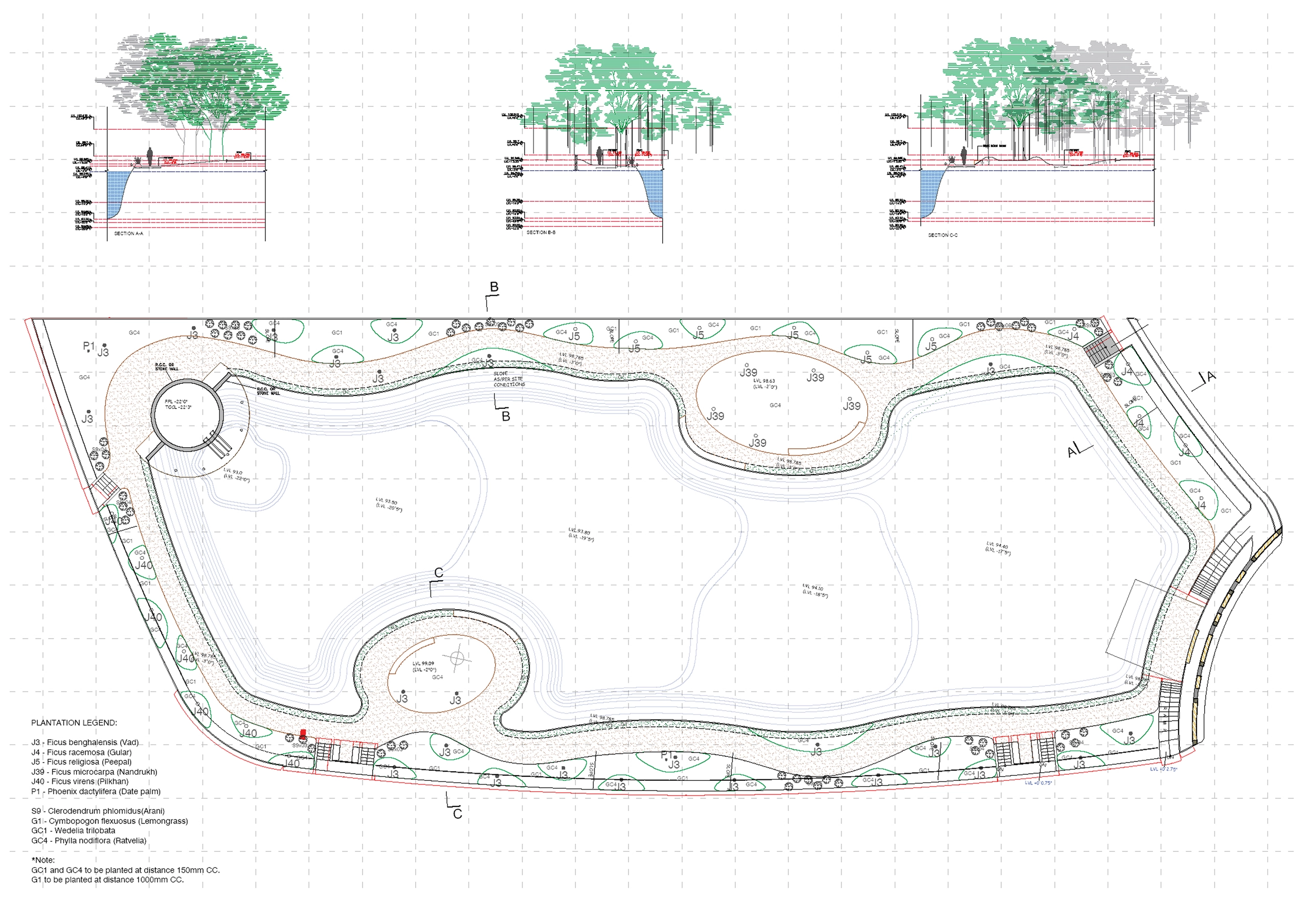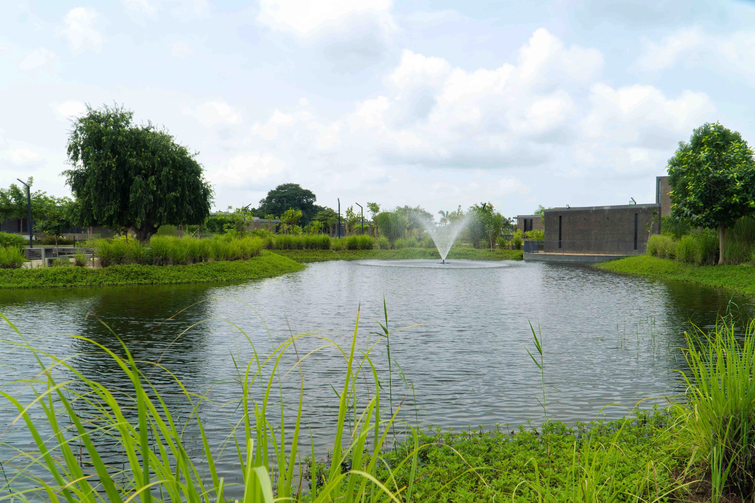 The site’s abundance of water-loving tree species, like Pilu (Salvadora persica), inspired the landscape design of the lake as a ficus haven, with over six species of native ficus trees incorporated into the design. These trees thrive in moist, water-rich environments, making them perfectly suited to this location. The design includes a peripheral walkway with strategically spaced sit-outs, gravel courts and pavilions overlooking the lake. Rows of lush native grasses interspersed among the ficuses complement the built elements and create a buffer between the lake and the walkway edge, enhancing both aesthetics and functionality.