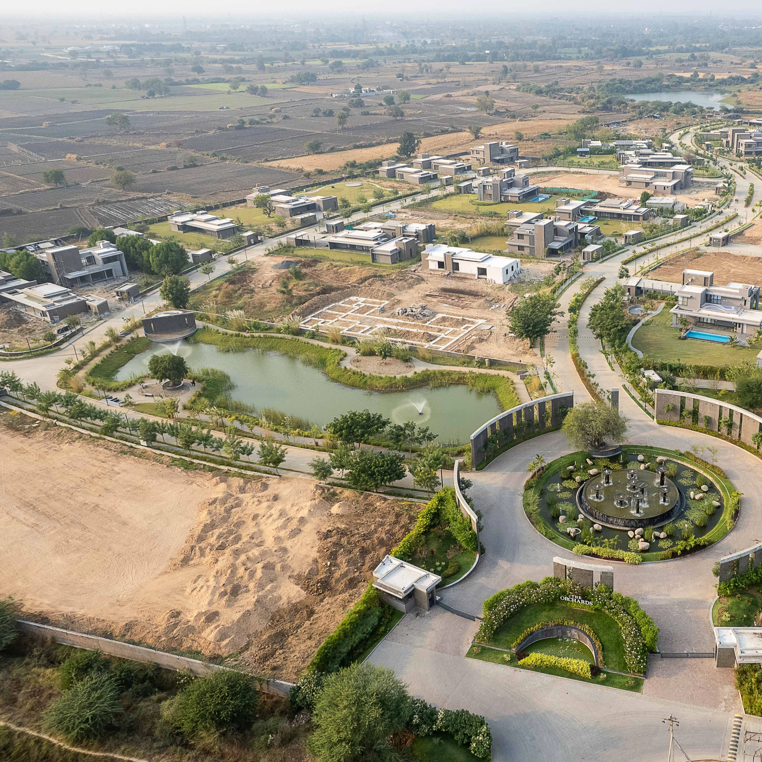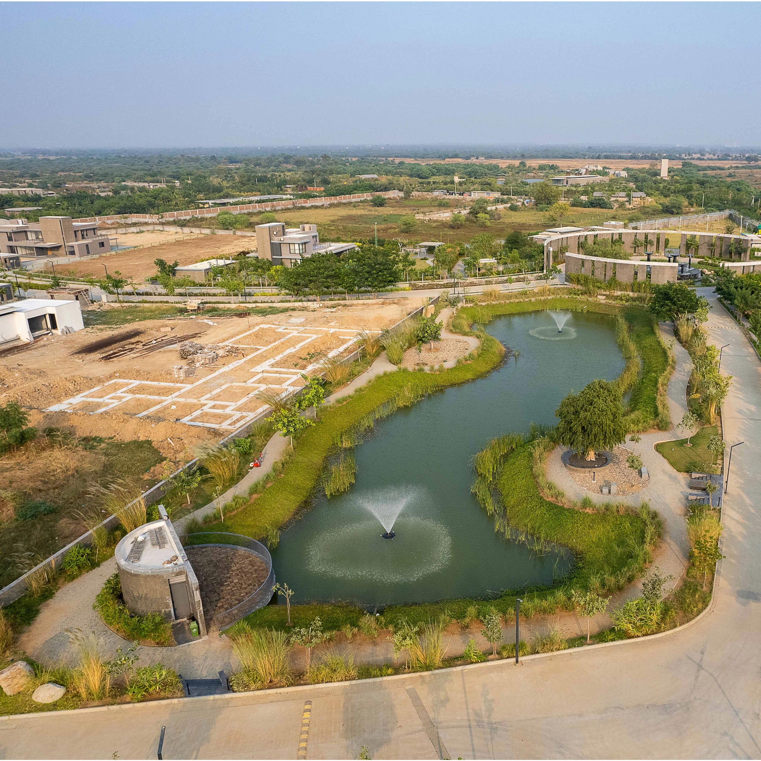 The lake design for the common plot of 'The Orchards' is part of a comprehensive masterplanning project near Kanjari village. Situated in a naturally low-lying area, the lake is designed to collect stormwater from the entire site and is left unlined to allow maximum percolation, with excess water drawn back for irrigation purposes.