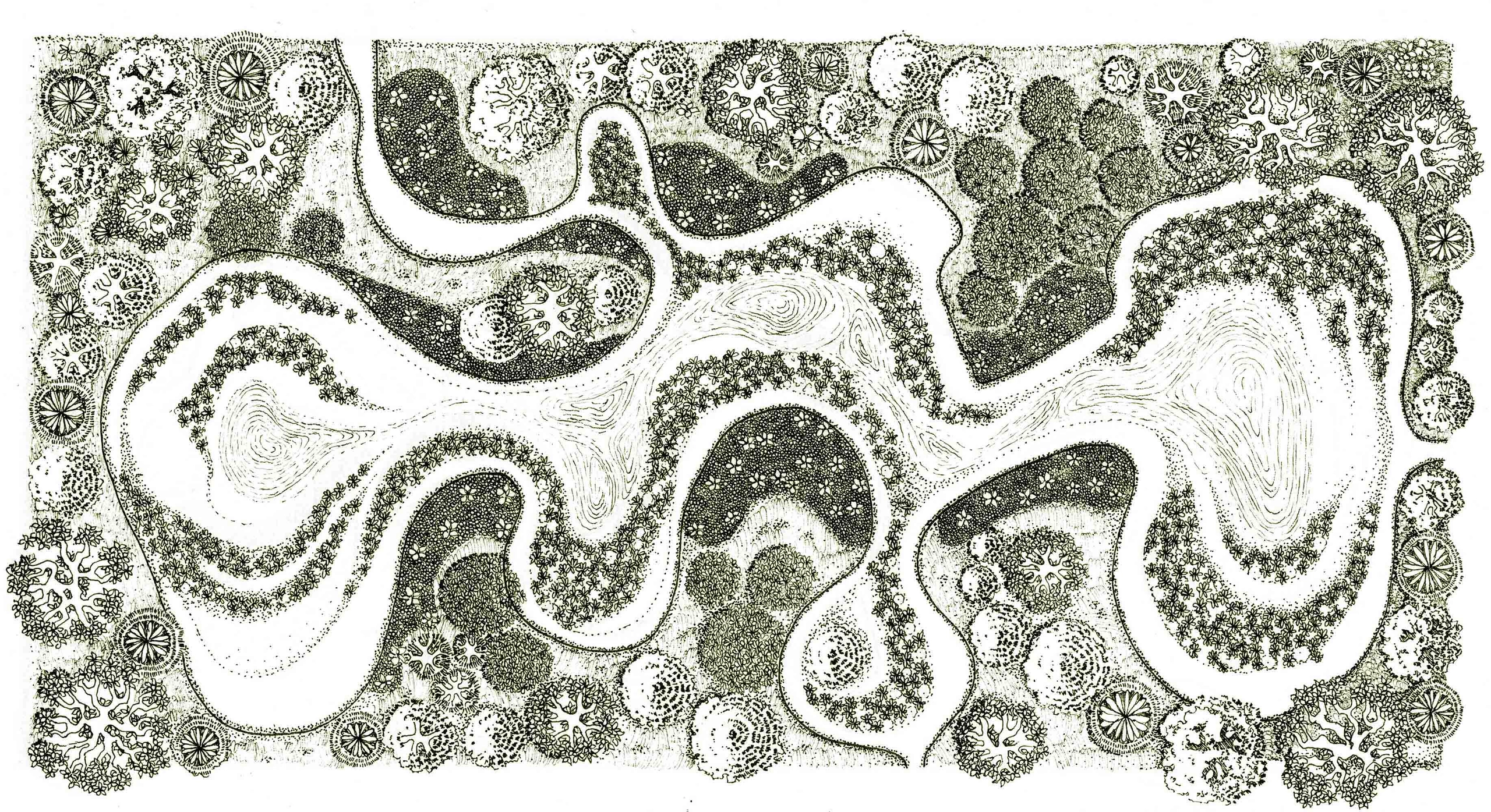 This rectangular plot is transformed into wild a wetland and grassland that is characteristic of the region. A winding path leads one through tall grasses and dense shrubs. The land starts to descent from the edges of the path. While the garden dips in the centre, the borders of the garden rise into gentle mounds. Mixed Fruit orchards populate the garden while native, wild and forgotten species take root in the left over spaces. Out of this wild garden, designed to develop an ecology in the area, emerge open and secret spaces, spaces for gathering and reflection.
