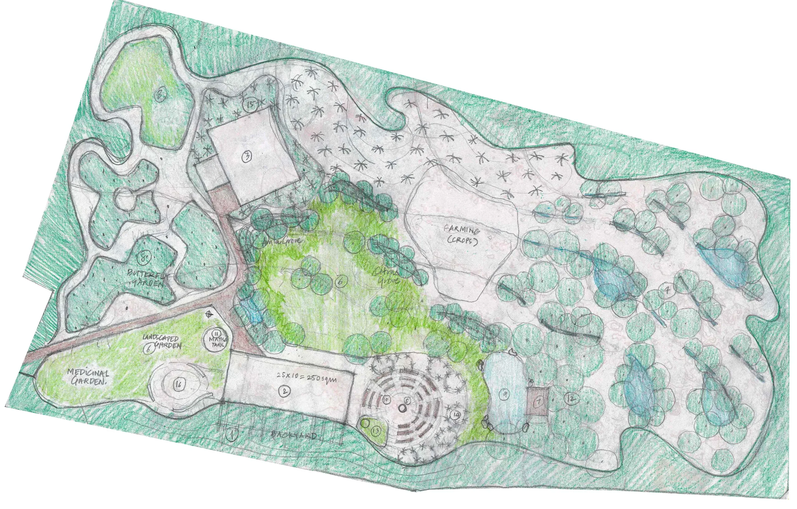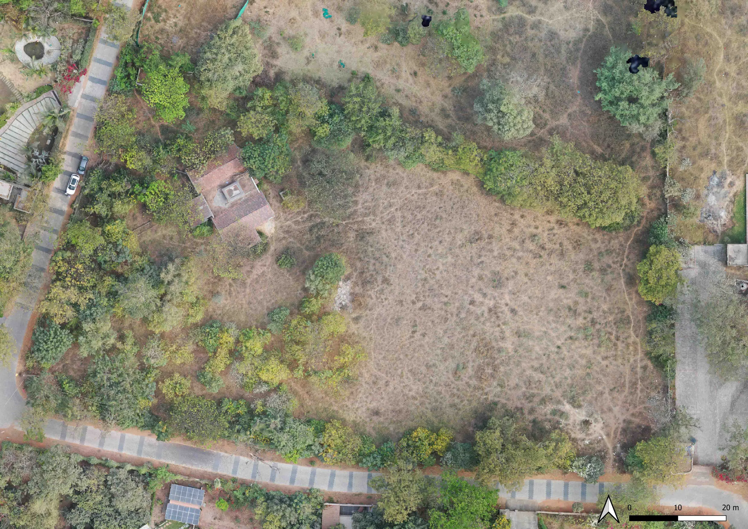 This landscape project in Rancharda, Ahmedabad is designed as a functional weekend retreat that integrates recreational spaces within a permaculture garden. The design incorporates a series of structured elements for outdoor activities, circulation, and productive cultivation. A gravel pathway runs around the house, connecting multiple seating areas positioned for shade and usability. This pathway transitions into different landscape elements, at times leading to a bio-lined pond designed to support water retention, and at other times opening into courts within the orchard. A small kitchen garden is located near the outdoor dining area to facilitate easy access to fresh produce. The planting strategy prioritizes productive and edible species, with an orchard featuring citrus species such as bael, starfruit, lemon, and bijoru, alongside fruit-bearing trees including amla, kothu guava, sitaphal, mango, chickoo, setur, tamarind, and bor.