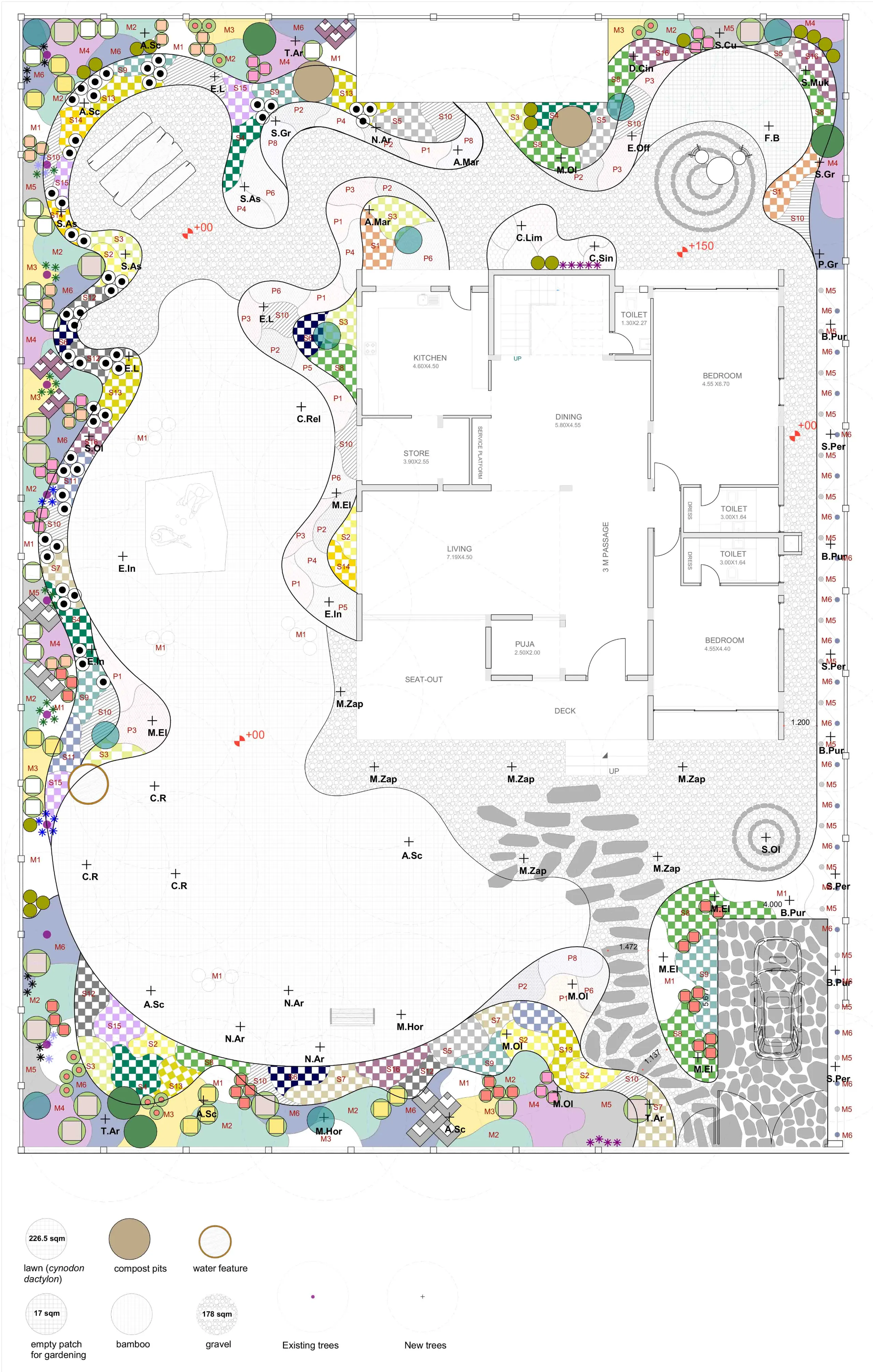 The hardscape consists of gravel and selectively retained lawn areas to balance accessibility and permeability. At the front, the entrance transitions into a lawn enclosed by dense planting, creating a well-defined green buffer. The rear garden features a gravel surface with a small court shaded by trees, designed as a flexible space for outdoor dining or seating. A meandering gravel path connects these spaces within the landscape while enhancing its visual continuity.