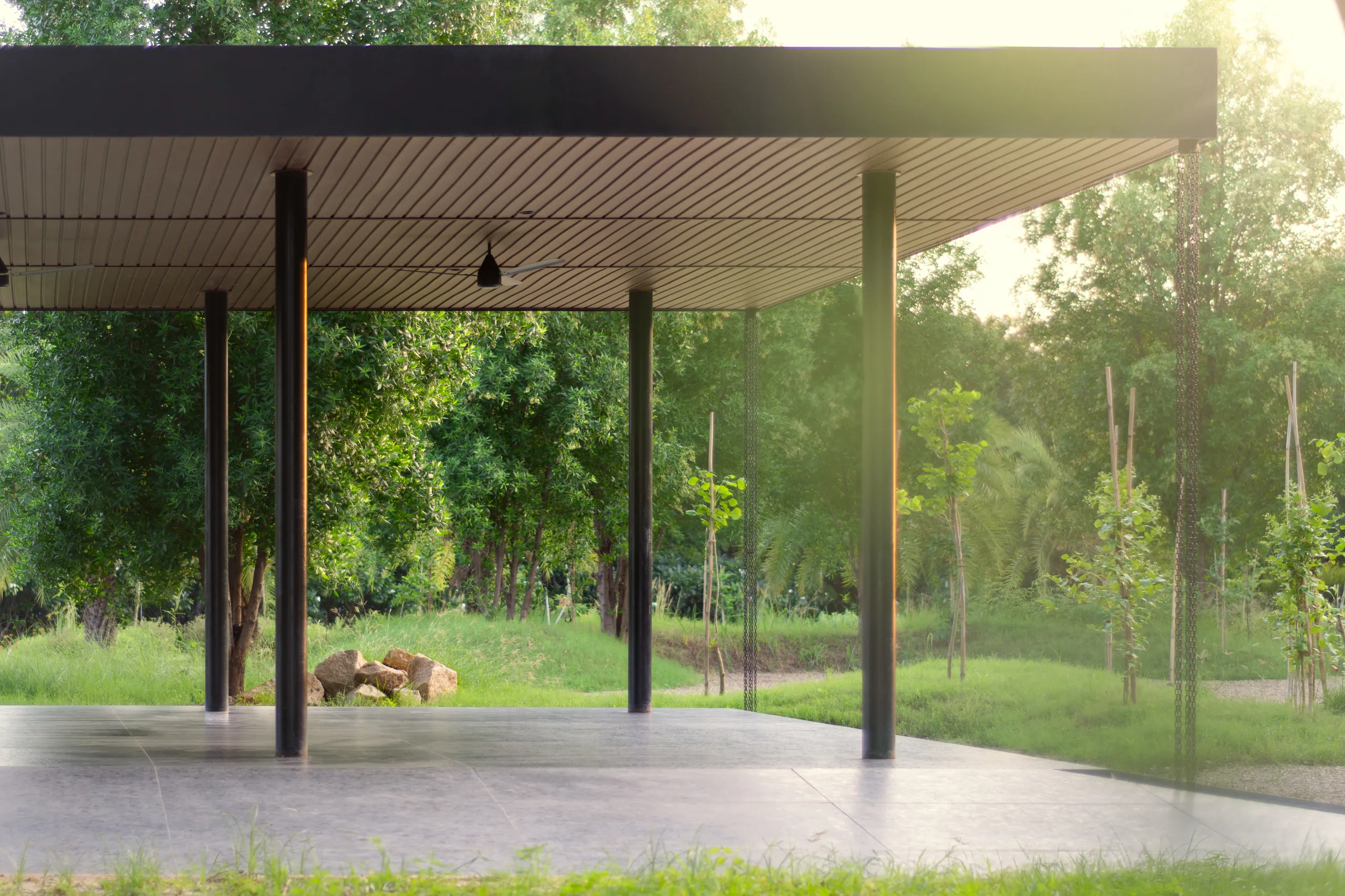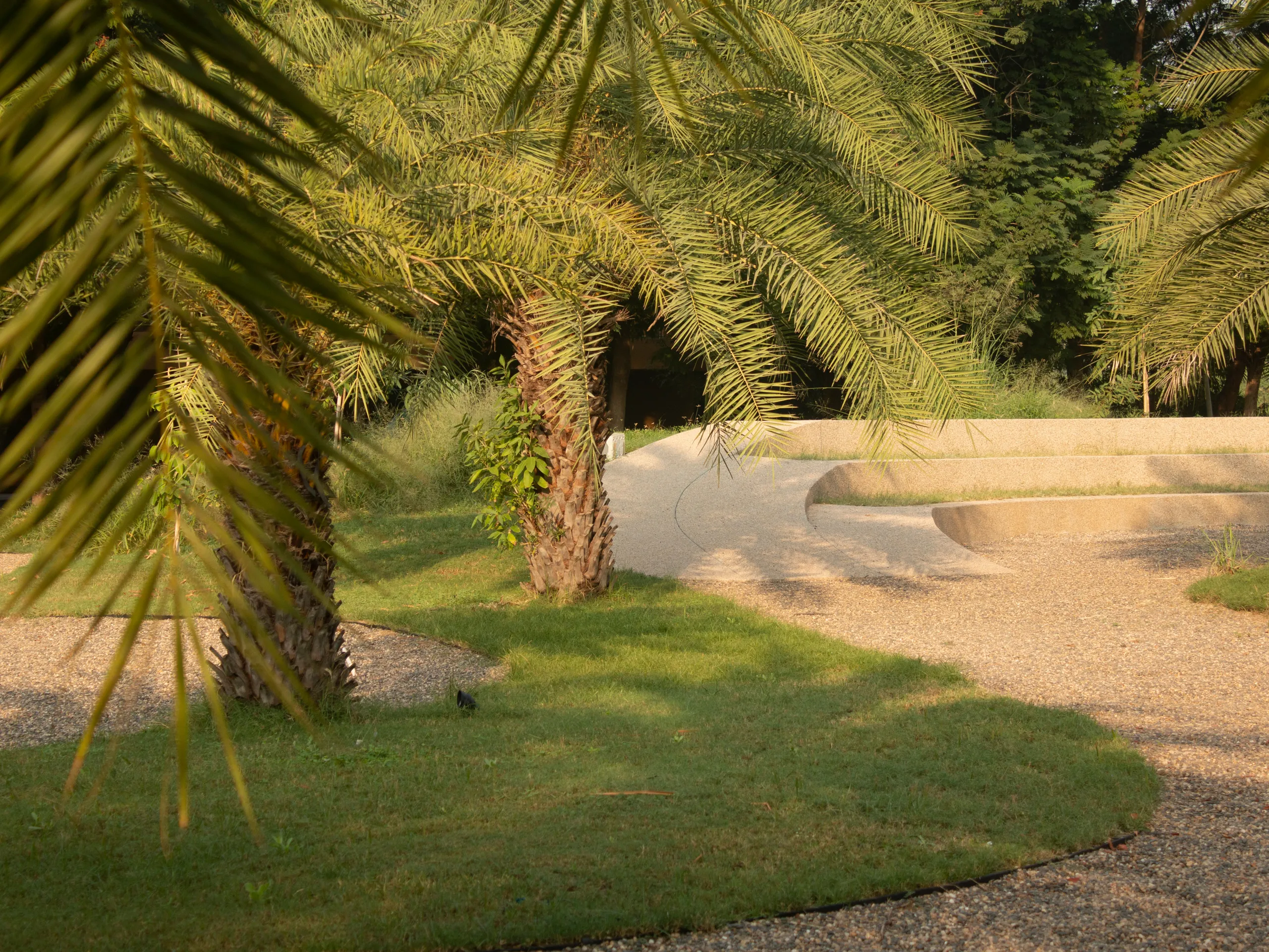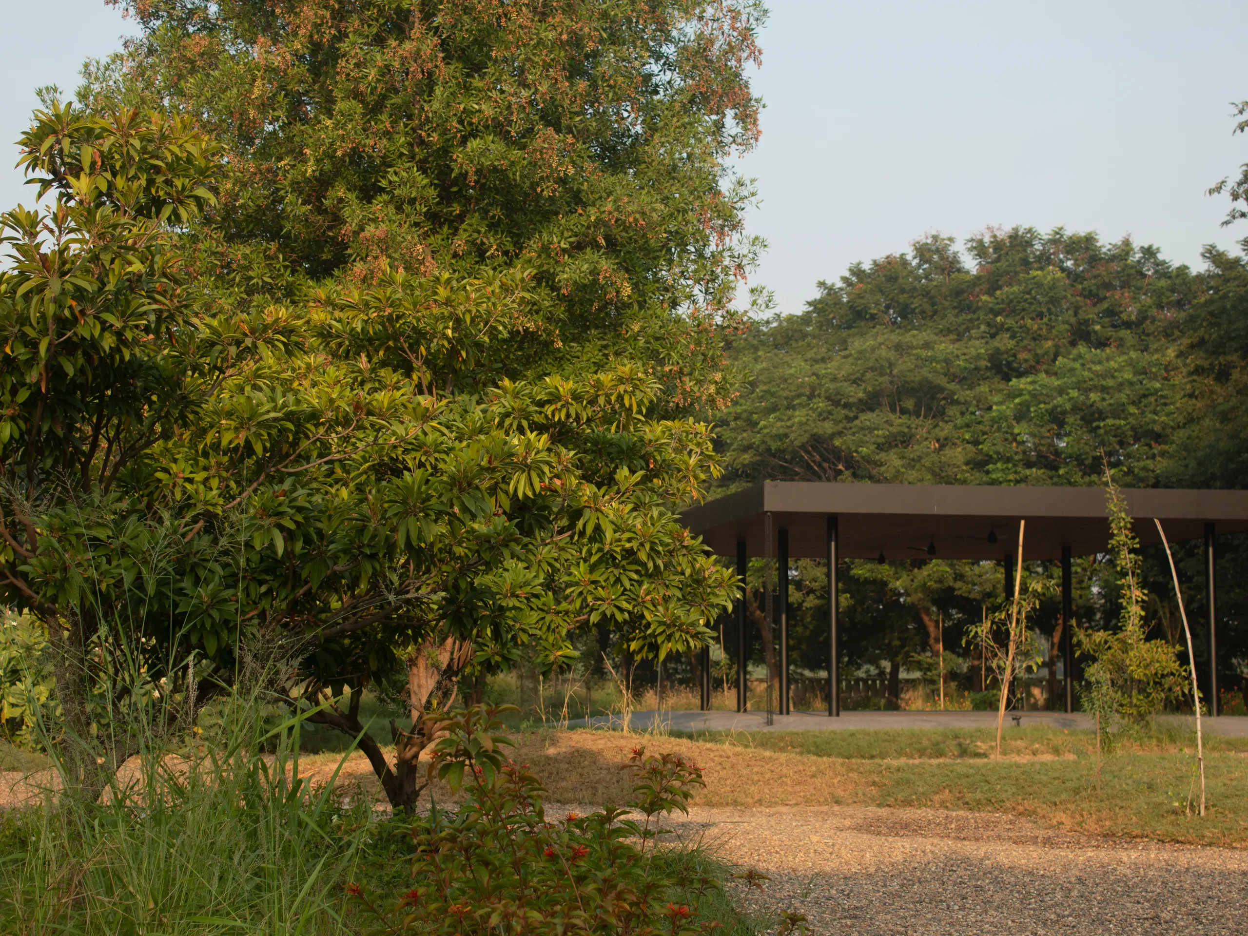 At the center of the gravel court stands a lightweight pavilion structure, designed with a simple and functional approach. The grey sandstone flooring transitions seamlessly into the surrounding gravel, grounding the structure within the landscape. Framed by an open, airy design, the pavilion offers shaded space while perfectly capturing views of the chikoo orchard and date palm grove.