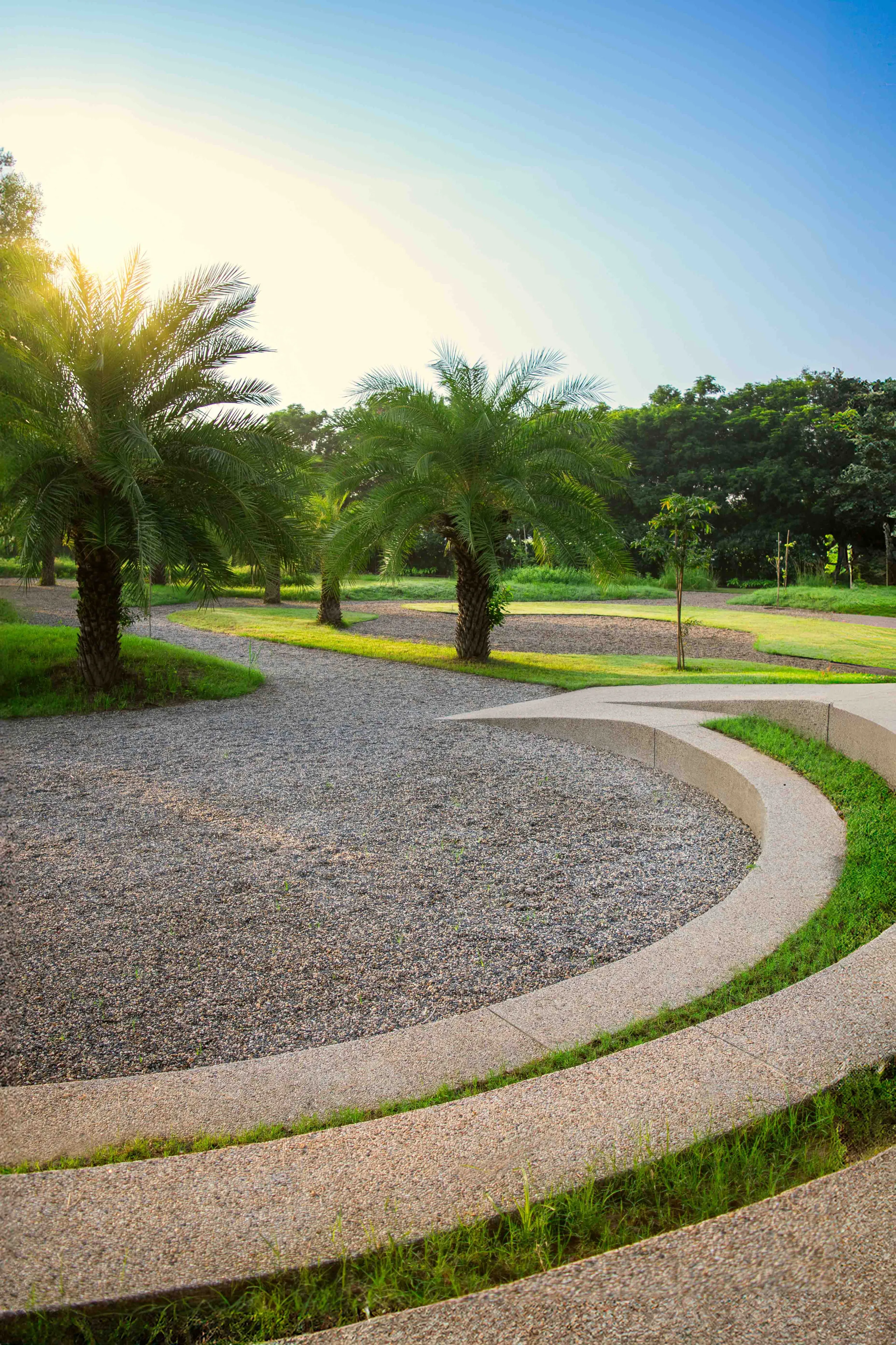 The Gravel Court at Rethal Greens is a large open area surrounded by mature trees and is an insert to the existing resort within the scheme. Designed as a gravel court instead of a traditional lawn, it is punctuated with features like an amphitheater, a pavilion, a chikoo orchard, and bamboo groves, providing spaces for small events and gatherings. The gravel allows water to percolate through and acts as a vast rainwater sink, enabling the recharge of millions of liters of water into the ground each monsoon.