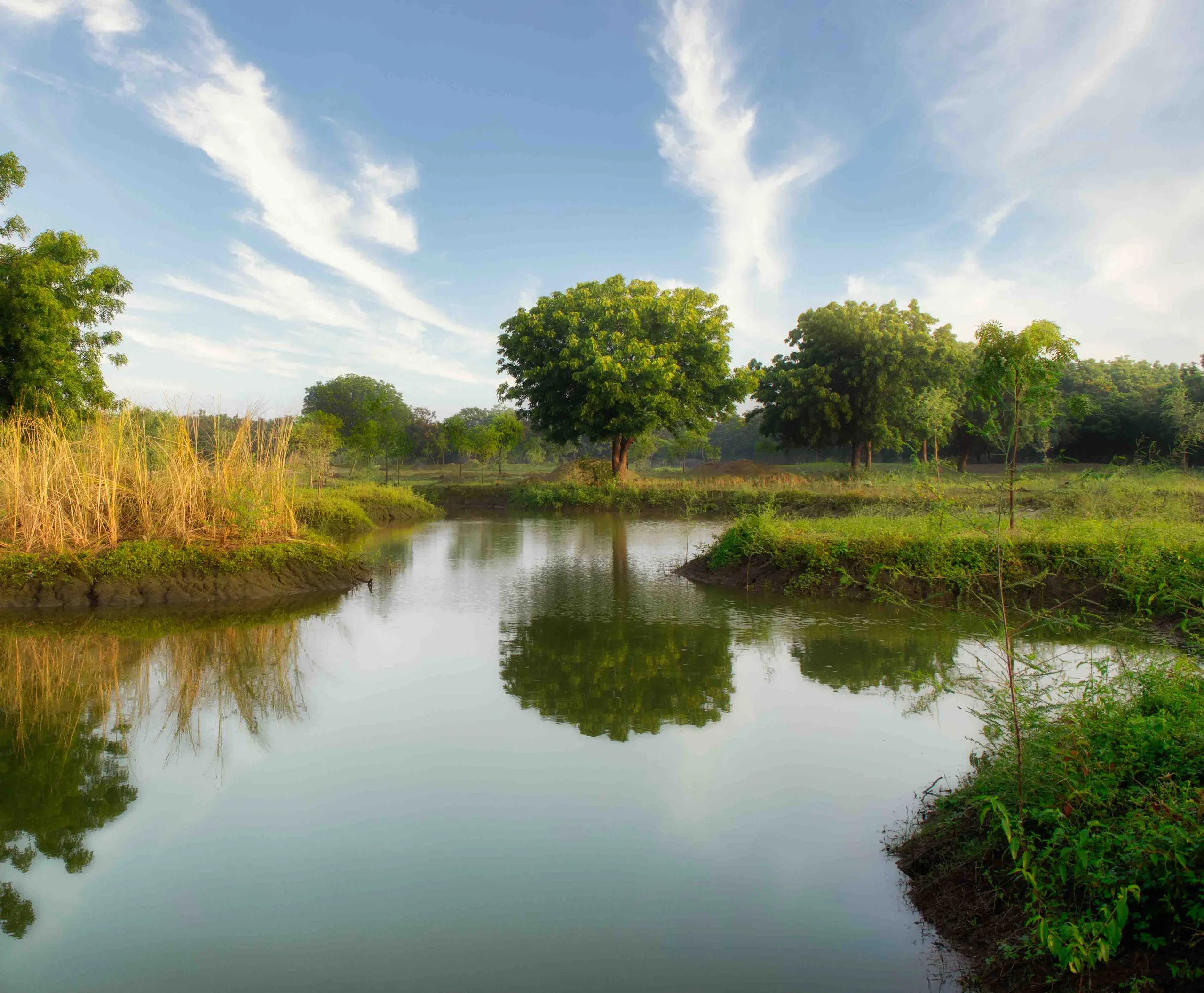 The expansive 7.2-acre Common Plot at Rethal Greens is designed as a natural wetland and grassland, reflecting the ecological character of the region. Integral to the scheme’s larger water management strategy, this seasonal waterbody collects runoff from the entire site, enabling maximum water percolation and groundwater recharge.