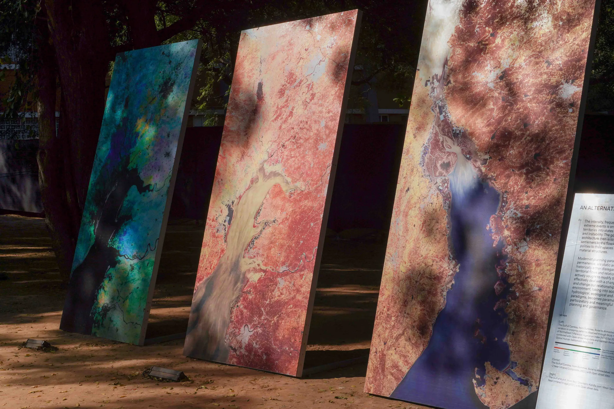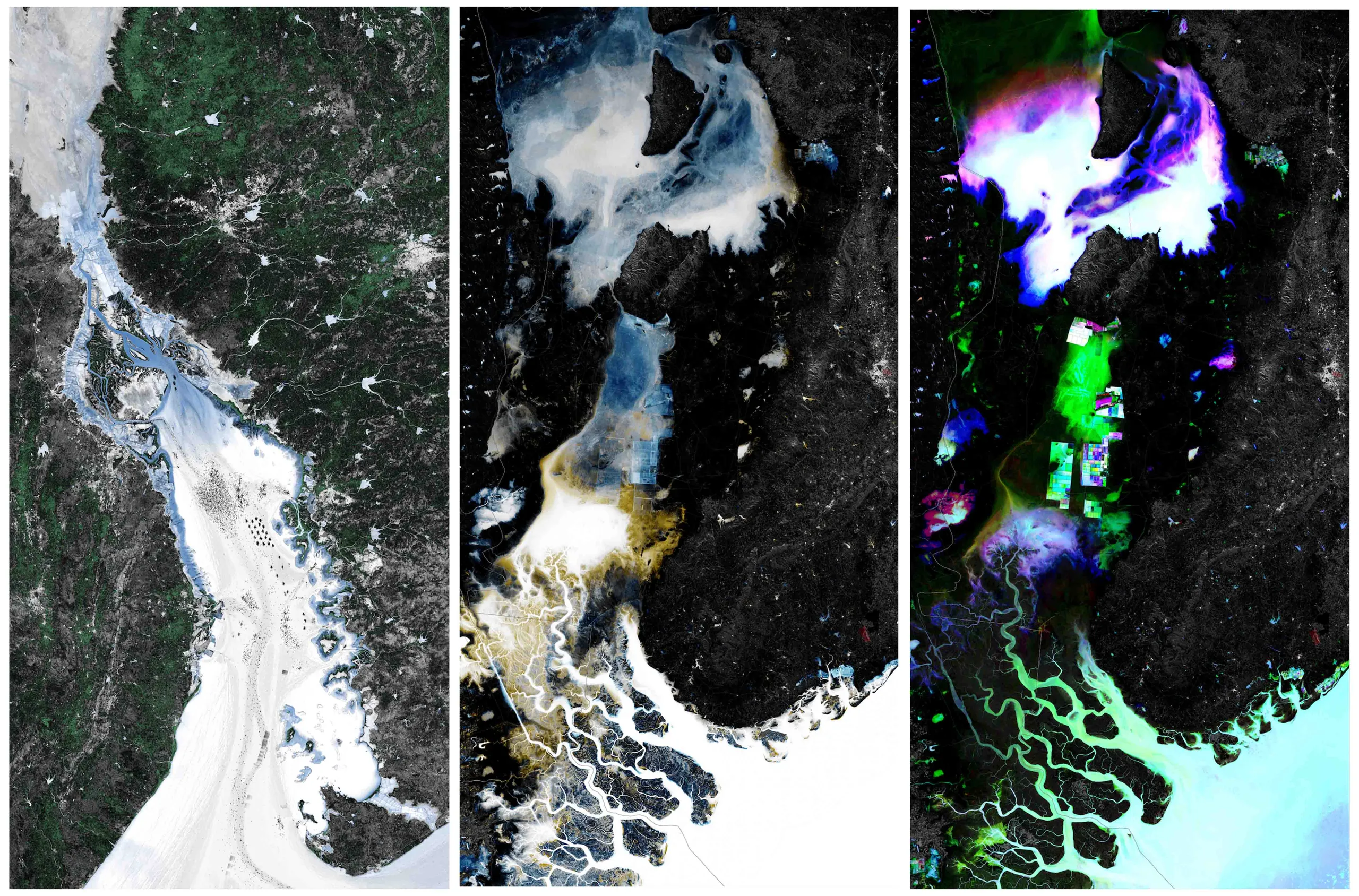 Human activities in the Indian peninsula have transformed ecological, cultural, hydrological and energy systems, modifying these dynamic processes, in ways beyond our ability to conceptualise them. The project investigates the major shifts of rapid urbanisation, industrialisation, large infrastructural interventions and the effects of anthropogenic overheating in Gujarat. Turbulent Displacements captures remote sensing data and images that track various territorial transformations of our lands and waters.