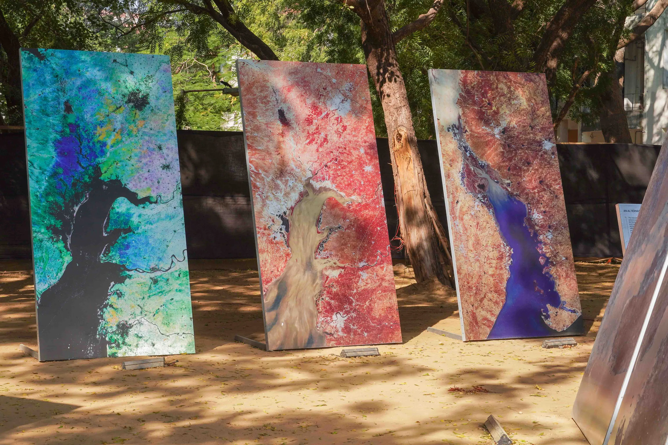Turbulent displacements is a body of work that was displayed at Abhivyakti City Arts Exhibition held in November 2022 in Ahmedabad. The exhibit utilized remote sensing data and satellite imagery to analyze territorial transformations in Gujarat’s land and water systems. By integrating multi-source geospatial dataset- including OpenStreetMap, multi-spectral and multi-temporal Earth observation, radar satellite imagery, and topographic data, the project provided a comprehensive perspective of urbanization, industrial expansion, infrastructural interventions, and environmental shifts in the region.