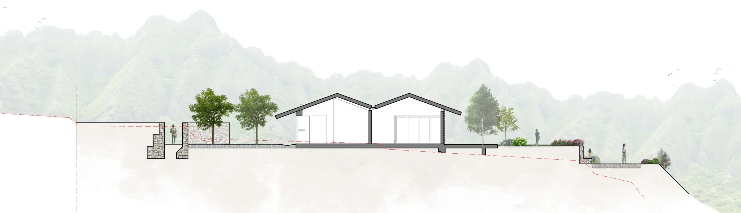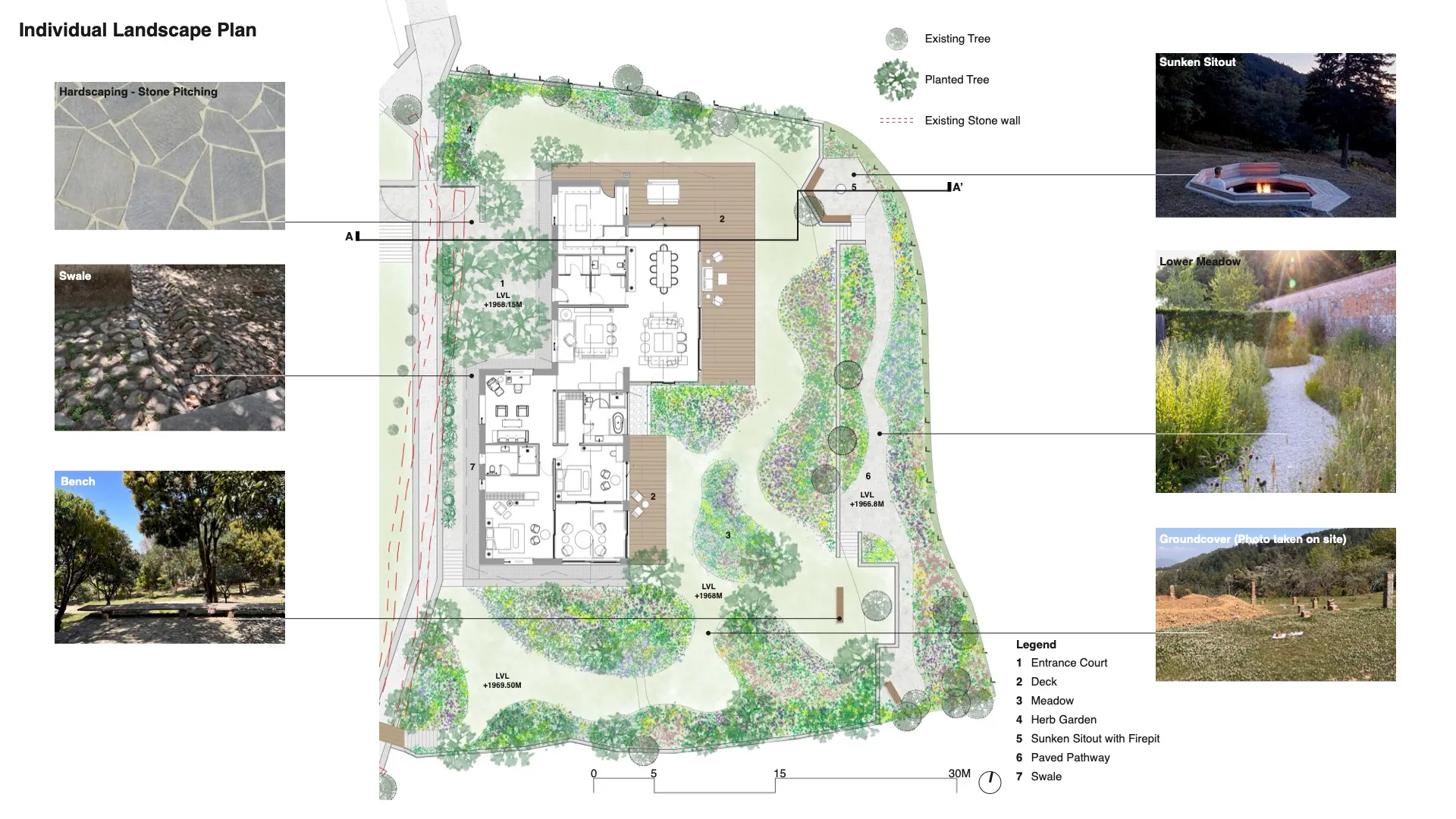 The gardens extend from the main deck, each oriented toward the mountains into a series of stepped terraces that open up to wide views. These terraces are planted with native meadows and native trees. The landscape design closely follows the site’s natural topography and is graded to guide water flow naturally, using swales and channels for efficient drainage, while maintaining the site’s ecological integrity.